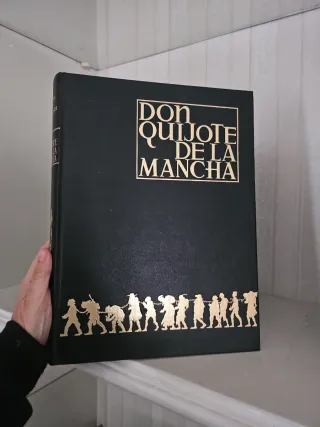 Este es un libro de edición coleccionista de El ingenioso hidalgo Don Quijote de la Mancha de Miguel de Cervantes Saavedra, escrito a mano. La cubierta muestra un grabado del autor, Miguel de Cervantes, en su escritorio. Es una edición de lujo o especial, de tapa dura y con detalles en relieve dorado. La obra es considerada la primera novela moderna y una de las más importantes de la literatura universal. Cervantes, el autor, nació en Alcalá de Henares, donde se encuentra su casa-museo