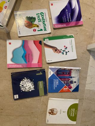 1-Física y Química 1. Ed. sm. (7€).2-Oral Skills Companion 1 Ed. Oxford Jane Hudson (7€) 3-Tribu 2 Cahier D'exercices Aline Volte .Ed. Oxford educación. (7€). 4-Economía 1 Andalucía Ed.Algaida (5€). 5-Matemáticas 1. Editorial sm. (7€). 6-Matemáticas 2. Editorial sm. (7€). 7-Biología y geología 1. Editorial sm.(7€). 8-Historia de la filosofía 2º bachillerato (5€)