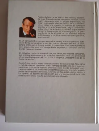 David Ogilvy, considerado el padre de la publicidad moderna. El libro recopila la filosofía, técnicas y experiencias de David Ogilvy sobre cómo crear publicidad efectiva que venda. Incluye un prólogo escrito por Luis Bassat, un reconocido publicista español. Es una obra fundamental para entender la importancia de la investigación y la honestidad en la comunicación publicitaria