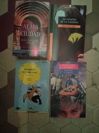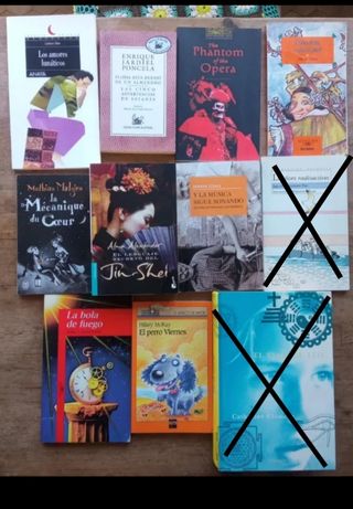 1'5€ cada libro: Los amores lunáticos de Lorenzo Silva Eloísa está debajo de un almendro y las cinco advertencias de Satanás de Enrique Jardiel Poncela The Phantom of the opera de Jeniffer Bassett Esborratí, esborratot de Merce Viana La Mecanique de coeur de Mathias Malzieu El lenguaje secreto del jin Shei Alma Alexander Y la música sigue sonando Graham Stokes La bola de fuego John Christopher El perro viernes Hilary Mckay El alma de la ciudad Jesús Sánchez Adalid Els sommnid de la nassima Merce Rivas Torres Un montón de problemas Ternce Blacker No em pots dir adeu Jesús Cortés 2V