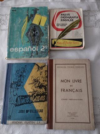 Español 2 Curso de BachilleratoS.M. 12€ Editorial Bruño 1967 Tapas Blandas_ 237 páginas Algún escrito Breve Ortografía Escolar Décimo tercera edición 1967 Manuel Bustos Sousa Editorial Mundo Escolar 111 páginas 8€ Tapa Blanda. Niños y Cosas Segunda Edición José M. Villergas Editorial Atlántida S.A. Tapa dura _ 1959 ?? 112 páginas. 6€ Dibujos coloreados Papel sepia Mon Livre de Francaise 1946 Germana Pujula 86 páginas Tapa dura Papel color sepia Muy bien estado. 6€ Medidas Distintas medidas