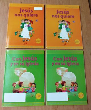 Libros de catecismo para niños. Jesús nos quiere (2 Unidades) Libros de tapas blandas para la iniciación de los niños a la vida Cristiana. Los libros estaban escritos a lápiz pero se han borrado. ISBN: 978842853482-6 Con Jesús y en su iglesia (2 Unidades). Libros de tapas blandas para la formación Cristiana. Iniciación de los niños a la vida cristiana-2. Los libros estaban escritos a lápiz pero se han borrado. Los libros están forrados. ISBN: 978842853483-3.