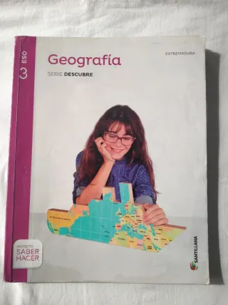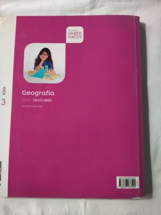 Vendo libro de geografía para 3 ° ESO, editorial Santillana, proyecto saber hacer, serie descubre, ISBN 9788468033594, alguna página cruzada a lápiz pero casi sin usar, hago envíos y preparo lotes, precio 2 euros.