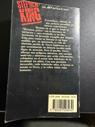 Libro en la que se baso la popular pelicula IT, cuyo autor es el famoso Stefhen King, es de tapa blanda y esta forrado, contiene el nombre del anterior dueño y una fecha, dentro en una hoja del principio, pero no afecta para nada. 1215 paginas. MIRA MIS OTROS ARTICULOS EN MI PERFIL
