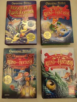 4 libro de Gerónimo Stilton, * Noveno viaje: el rescate del reino de la fantasía * Décimo viaje: reconquista del reino de la fantasía * Undécimo viaje: el gran secreto del R.F * Duodécimo viaje: la isla de los dragones del R.F. Muy bien conservados Precio original 24,95€ Precio por todos 36€ Precio unidad 10€
