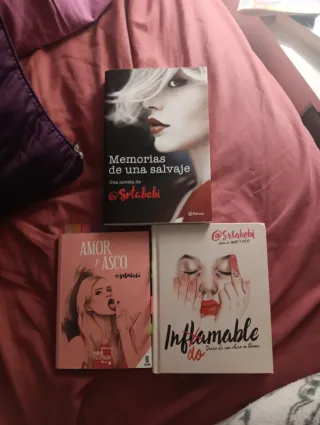 Varios libros escritos por la srta.bebi (activista feminista en redes sociales): dos de sus libros de poesía y su novela acerca de la prostitución. Pueden comprarse de manera conjunta (15 euros) o por separado (5 euros cada libro de poesía y 7 euros la novela). Uno de los poemarios solo tiene post-its, pero se lo quito. Todos están en perfecto estado sin subrayados, tachones o alguna marca.