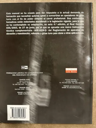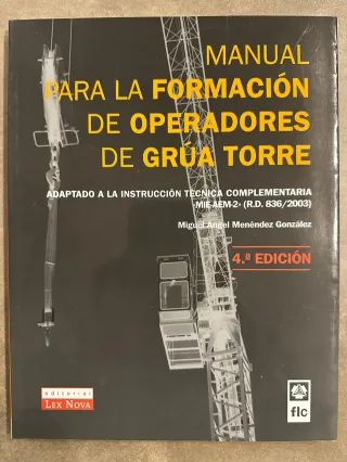 Detalles del producto MANUAL PARA LA FORMACION DE OPERADORES DE GRÚA TORRE Editorial Lex Nova Este libro aporta todos los contenidos teóricos y prácticos (características de la grúa torre, reglamentación aplicable, maniobras y señales, electricidad y mecánica) necesarios para quienes quieren obtener el carnet profesional y convertirse en operadores de grúa torre, de acuerdo con la norma UE 58-101-92. Su contenido formativo se ha adaptado al Real decreto 836/2003, porque se aprueba una instrucción técnica complementaria MIE-AEM-2. Dispongo de varios ejemplares nuevos de la 4a edición (2 unidades) Autor MIGUEL ANGEL MENENDEZ GONZALEZ