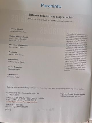 Libro “Sistemas Secuenciales Programables”, editorial Paraninfo, utilizado en formación técnica de electricidad industrial, automatización y programación de PLC. Libro muy utilizado en formación profesional y cursos técnicos, ideal para estudiantes de: • electricidad industrial • automatización • PLC • mantenimiento industrial • electrónica ✔ Muy buen estado ✔ Sin subrayados ni anotaciones ✔ Tiene algún test corregido ✔ Páginas limpias y perfectamente legibles Perfecto para estudiar PLC y automatización industrial.