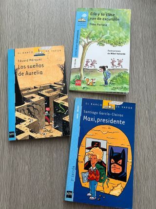 4€ la unidad Barco de vapor colección color azul, lecturas recomendadas para niños a partir de 7 años - Santiago García-Clairac Maxi, presidente 9788434844698 - Eduard Márquez Los sueños de Aurelia 9788467503043 - Elia - VENDIDO Todos son de la editorial SM en tapa blanda ilustrada