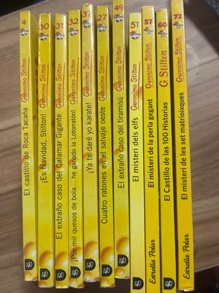 Precio a convertir según packs: Nº 3: El misteriós manuscrit de Nostrarratus (catalán) Nº 9: El misteri del tresor fantasma (catalán) Nº 17: L’estrany cas de la Rata Poeta (catalán) Nº 30: És Nadal, Stilton! (catalán) Nº 38: La vida en rodet (catalán) Nº 42: Fora les puces, Cua de formatge! (catalán) Nº 58: Geronimo se’n va de casa (catalán) Nº 62: El meu nom és Stilton, Geronimo Stilton (catalán) Nº 74: La meravellosa val·liada de xocolata (catalán) Nº 86: El misteri de la piràmide de formatge (catalán) Otros de colección amarilla (sin número en el lomo) L’illa del tresor fantasma (catalán)