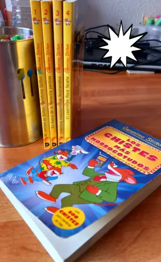 Los 4 primeros libros de la colección: mi nombre es Stilton, en busca de la maravilla perdida, el misterioso manuscrito de Nostrarratus, el castillo de roca tacaña y libro de chistes