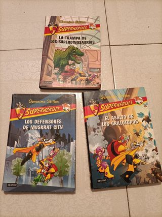 Tres libros de la colección de SUPERHÉROES de JERÓNIMO STILTON. El asalto de los grillotopos. La trampa de los superdinosaurios. Los defensores de Muskrat City. Usado pero en buen estado. Tapa blanda. Editorial Destino. Uno por 5€. Los tres por 12€