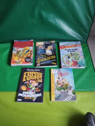 Lote Libros Gerónimo Stilton. Precio lote completo de los 5 libros: 16€ Precio de cada libro suelto: 5€ "En el Reino de la Fantasía" : Tapa dura. Mucho más grueso que el resto (más de 300 pág. Muy ameno y divertido de leer). "Atrapado dentro del museo". Formato Escape Book. Tapa blanda. 90 pág. Muy divertido. El lector interviene en las decisiones. "Las aventuras de Sherlocko. Misterio en la calle de las Intrigas": Atrapa desde el inicio. Tapa blanda. 125 pág "Superhéroes. ¡Alarma, fétidos en acción!: Tapa blanda. 190 pág. Muy buen estado pero forrado y con uso. " Agente Secreto Cero Cero KA": Tapa blanda. 115 pág. Buen estad