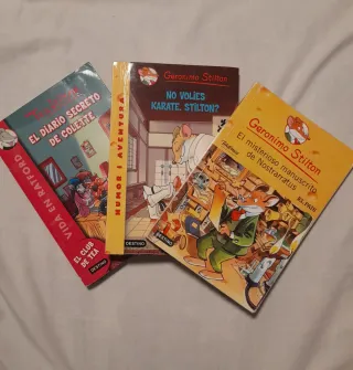 Se venden 7 libros. Algunos en castellano y otros en catalán. Castellano El fantasma del metro El galeón de los gatos piratas (falta la primera página). Mi nombre es Stilton , Gerónimo Stilton. El amor es como el queso El extraño caso de la noche de Halloween Català Seguint la pista del Yeti Gerónimo se'n va de casa Tienen bastante uso, pero las paginas están muy bien. TODOS POR 7€