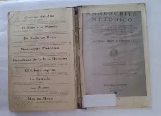 PRECIO NO NEGOCIABLE, SOLO HAGO ENVÍOS 3 libros: 'España, Mi Patria' Libro Quinto, (Dalmáu Carles, Pla, S.A. Editores, 1932) Cubiertas y lomo desgastados. Por dentro contiene todas las páginas. Este libro no es parte del régimen franquista, es anterior y fue empleado en las escuelas antes de la dictadura. Su 1a edición fue en 1928, antecede al franquismo (1939 - 1975), aunque refleja un tipo de nacionalismo que luego sería adoptado y amplificado por el régimen. + Enciclopedia Grado Medio + Manuscrito metódico: colección de cartas, documentos mercantiles y oficiales, autógrafos y trabajos literarios propios