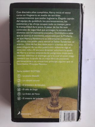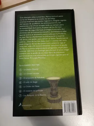 ¡El sexto año y la búsqueda de Horrocruxes! Vendo "Harry Potter y el Misterio del Príncipe" de J.K. Rowling. Trama: Harry inicia su sexto curso y el Señor Tenebroso se acerca. Dumbledore pide ayuda a Harry para intentar debilitar a Voldemort, contando con la ayuda de un misterioso profesor de Pociones conocido como el Príncipe Mestizo. Edición: Clásica de Salamandra en Tapa dura. Ideal para: Coleccionistas de la saga en formato de tapa dura. ¡Una entrega clave y muy emocionante!