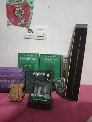 Conjunto de productos de Harry Potter con temática de Slytherin. - Dos libros de la saga: Harry Potter y la cámara secreta y Harry Potter y la piedra filosofal. (12€) - Monedero verde con el escudo de Slytherin. (1€) - Set de sello de cera de Slytherin.(2€) - Figura decorativa/sello de Snape. (de regalo) -Varita de coleccionismo de Draco Malfoy. (10€) - Hucha del autobús Harry Potter (2€) - Llavero o colgante con el escudo de Slytherin. (1€) -Figura de juguete de Luna con accesorios. (3€) Lote entero 20€