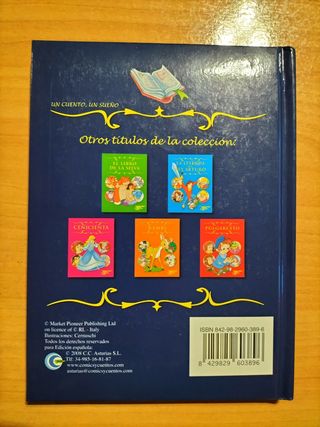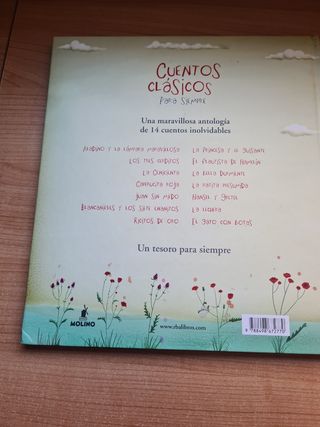 Libro con varios cuentos clásicos como: Cenicienta, El gato con botas, Caperucita Roja,El patito feo, El ruiseñor del emperador,Blancanieves y los 7 enanitos, La niña de las ocas,La bella durmiente y Aladino y la lámpara maravillosa
