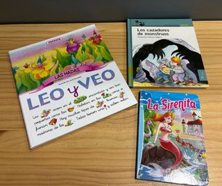 Tres libros infantiles preciosos. El clásico de La Sirenita, con hojas duras para los mas peques, Leo y veo Las Hadas, para aprender a leer o identificar los dibujos, y Los cazadores de monstruos de Alejandra Vallejo-Nágera.