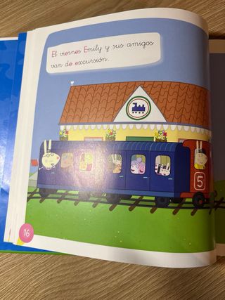 Libro con historias cortas de Peppa Pig para introducir a la lectoescritura. Cada historia se muestra en mayúsculas y en minúsculas con letra de caligrafía trabada.