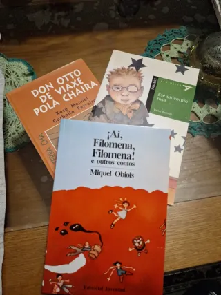 3 libros en gallego. 1er libro (ese unicornio rosa) en muy buen estado. 2do libro (Don Otto de viaxe pola chaira). 3er libro (Ai Filomena, Filomena e outros contos). Estos 2 últimos libros tienen un roto en el lomo donde estaba pegada la etiqueta de la biblioteca. En muy buen estado. Son libros descatalogados de biblioteca
