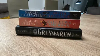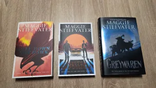 Trilogía The Dreamer de Maggie Stiefvater en inglés. Call Down The Hawk y Mister Impossible están en tapa blanda, Greywaren está en tapa dura. (La última foto muestra unas marcas que hay en la portada.)
