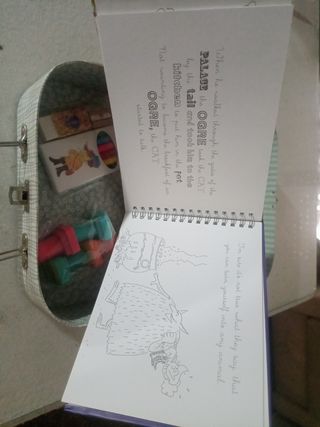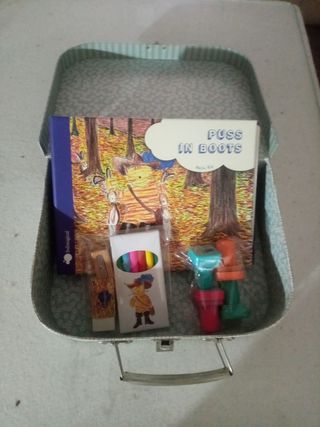 Maletín con libro de lectura en ingles y coloreable. Contiene 4 sellos, lápices de colores, goma y sacapuntas