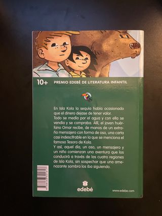 Libro de Edna López 2011 Premio edebé de literatura infantil En Isla Kola la sequía había ocasionado que el dinero dejase de tener valor. Todo se medía por el agua y con ella se vendía y se compraba. Allí, el joven huérfano Omar recibe, de manos de un extraño mensajero con forma de oso, una carta casi indescifrable en la que se menciona el famoso Tesoro de Kola.
