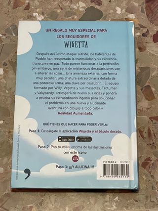 Libro de aventuras "Wigetta y el báculo dorado", creado por los famosos YouTubers Vegetta777 y Willyrex. Sinopsis: Después del último ataque, la tranquilidad de Pueblo se ve interrumpida por misteriosas desapariciones y una amenaza externa con forma muy peculiar. El equipo formado por Willy, Vegetta y sus mascotas (Trotuman y Vakypandy) arriesgará sus vidas en una nueva aventura. Características especiales: Es un "Libro interactivo con Realidad Aumentada". Incluye instrucciones para descargar la app y ver animaciones en 3D sobre las ilustraciones marcadas. Formato: Tapa dura (Cartoné) de gran calidad. ISBN: 978-84-9998-516-9. E