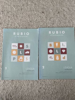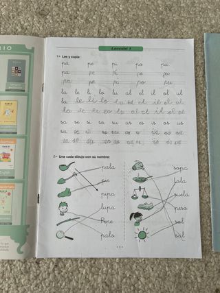 Cuadernos para afianzar el aprendizaje de los niños en los primeros niveles de educación primaria. El cuaderno 1 tiene hecha la primera pagina ( a lápiz) elresto del cuaderno 1 y el cuaderno 2 están sin hacer.