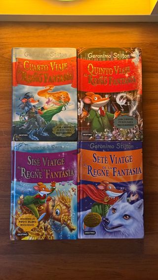 Conjunto de libros de Gerónimo Stilton, algunos en castellano y otros en catalan. Todos juntos 50 euros, 7 euros cada uno por separado. - Els defensors de Muskafarrat city - La gran invasión de Ratonia - En el reino de la Fantasía - Cuarto viaje al Reino de la Fantasía - Quinto viaje al Reino de la Fantasía - Sisè viatge al Regne de la Fantasia - Setè viatge al Regne de la Fantasia - Vuitè viatge al Regne de la Fantasia - Rescat al Regne de la Fantasia (novè viatge)