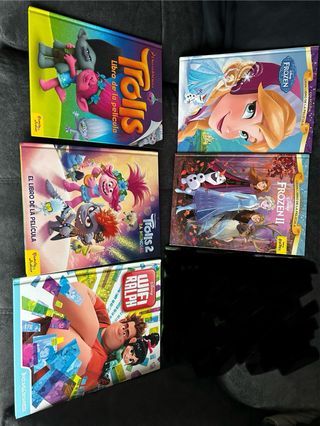 5 libros de películas infantiles en perfecto estado: Trolls 1 y 2, Frozen 1 y 2, y Wifi Ralph (busca y encuentra). Sueltos se venden por 5 euros los de Trolls y Frozen, y por 3 el de Ralph.