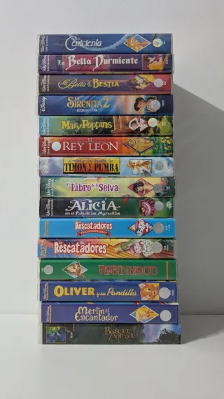 Colección de 15 películas clásicas de Disney en formato VHS. - La Bella Durmiente - La Sirenita 2 - Mary Poppins - El Rey León - Timón y Pumba - El Libro de la Selva - Alicia en el País de las Maravillas - Rescatadores (2 películas) - Robin Hood - Oliver y su Pandilla - Merlín el Encantador - El Bosque Animado - Cenicienta De regalo, VHS de los Teletubbies