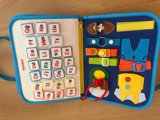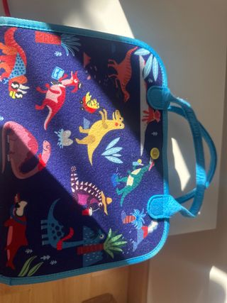 Libro de actividades sensoriales con temática de dinosaurios. - Material de fieltro suave. - Diseño colorido con dinosaurios. - Asas para facilitar el transporte.