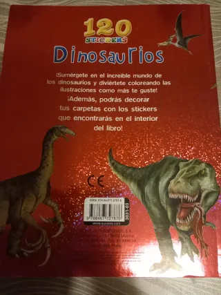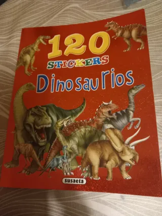 Título completo: 120 pegatinas de dinosaurios Editorial: Susaeta Ediciones Autores: Varios autores o Equipo Susaeta ISBN: 978-8467727876 Edad recomendada: A partir de 4 años, aunque algunas fuentes lo sitúan para 3-4 años. Encuadernación: Cartulina plastificada con holograma, interior con pegatinas. Sinopsis: El libro permite a los niños sumergirse en el mundo de los dinosaurios, colorear ilustraciones y usar las pegatinas incluidas para decorar.