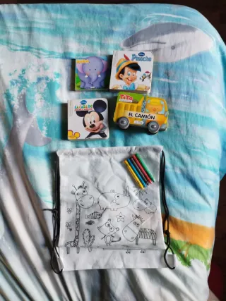 Lote 4 libros infantiles de tapa dura _Pinocho _ la casa de Mickey Mouse _Tito sobre ruedas , El camión _El Elefante Buba. También contiene una talega o bolsa para llevarla como mochila para colorear con crayón, esto nunca se ha utilizado. Entrego en persona, hago envío.