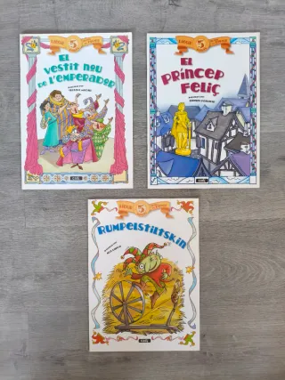 Llibres amb il·lustracions i lletra d'impremta. Inclou: -El vestit nou de l'emperador -El príncep feliç -Rumpelstiltskin