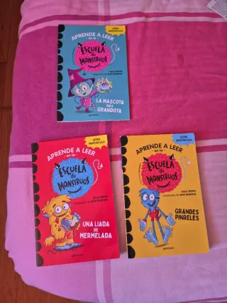 10 libros en catalán de la Escola de Monstres, son los siguientes: -1 Una mascota trapellota -2 Empastifada amb mermelada -4 Pues grans com gegants -5 Pastissos voladors de colors -6 Malifetes ben fetes -7 Pets i espetecs -8 Emociona de colors -9 Sapastre i bonastre -10 Dona'm gelat o l'hem liat -20 Una Festa que no resta. Libros ideales para aprender a leer. Tienen letra mayúscula. Están como nuevos. El lote de 10 lo vendo por 36 € . También se pueden vender individualmente, el precio sería 5€ la unidad. También dispongo de otro lote de libros en castellano, podría hacer buen precio por todos.