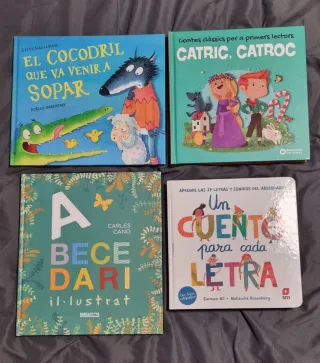 Cuatro libros infantiles,tapa dura,nuevos. Son comprados en Abacus - El cocodril que va venir a sopar(catalan) -Catric Catroc (catalan) -Abecedari (catalan) -Un cuento para cada letra (castellano). Son perfectos para niños que empiezan a leer. El precio es por los 4,si solo quieres uno será 7€. Se entregan cerca metro Fabra i Puig,Barcelona.