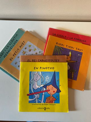 Pack de 6 libros para aprender a leer en catalan. Textos cortos en letra ligsda y de palo. Titulos que se incluyen: - Aladí i la llàntia meravellosa - En Pinotxo - El Petit Avet - La cigala i la formiga - Rimki Tikki Tavi - El rei carnestoltes