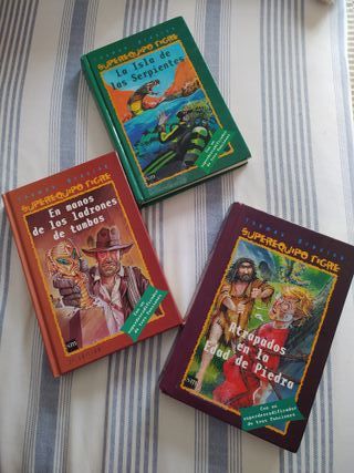 Saga incompleta de los libros de Super Equipo Tigre. Completamente recomendables para jóvenes que comienzan la lectura, fáciles de leer y cin dibujos. Cada libro dispone de un descodificar para revelar notas ocultas