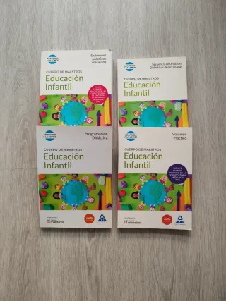 Cuatro libros para preparar las oposiciones de Educación Infantil. 1. Exámenes prácticos resueltos. 2. Programación didáctica. 3. Secuencias de unidades didácticas desarrolladas. 4. Volumen práctico. Solo recogida local. Pago al contado. No tengo bizum.