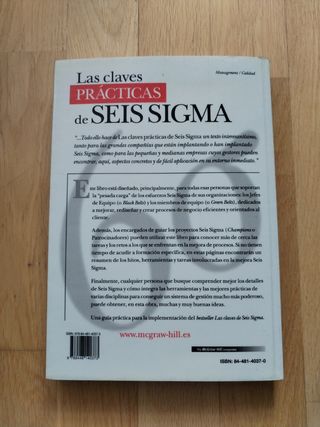 Las claves prácticas del Seis Sigma UNA GUIA DIRIGIDA A LOS EQUIPOS DE MEJORA DE PROCESOS. En Español EDITORIAL: McGraw-Hill, 382 páginas Se explica paso a paso como debe usarse el método seis-sigma En mágnífico estado, sin apenas uso y con aspecto nuevo. Ayuda que se forró estupendamente nada más comprarse para mantener las tapas intactas. TAGS: libro de informática, tecnologías de la información, TIC, I+D, mejora de procesos, procesos de negocio eficientes, mejora de servicios, gestión de calidad, gestión de proyectos, metodología, software, programación informática, programas, web, internet, hardware