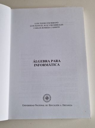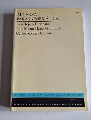 Álgebra para Informática - UNED Luis Tejero Escribano. Luis Manuel Ruiz Virumbrales. Carlos Romera Carrión. Editorial UNED. 344 páginas. En buen estado, sólo algo de polvo en el borde superior de estar en la estantería. ISBN: 84-362-2934-7