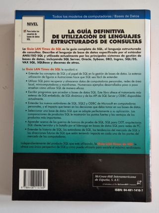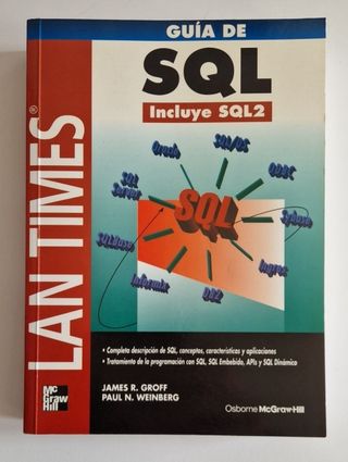 LAN TIMES - Guía SQL - Incluye SQL2. James R. Groff. Paul N. Weinberg. Editorial: McGrawHill. 634 páginas. ISBN: 84-481-1416-7 Muy buen estado, sólo algo de polvo de la estantería. La Guía LAN Times de SQL es la guía completa de SQL, el lenguaje estructurado de consultas. Describe el lenguaje de base de datos especificado por el estándar ANSI/ISO SQL y utilizado por los principales sistemas de bases de datos.