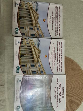 Libros completos de auxiliar administrativo del estado(valorado el pack en más de 200€), algunos temas están algo subrayado pero otros no, los 2 libros de estudio están anillados para su fácil manejo y estudio. Los libros están en perfecto estado. Temario general, específico, informática y psicotécnicos.