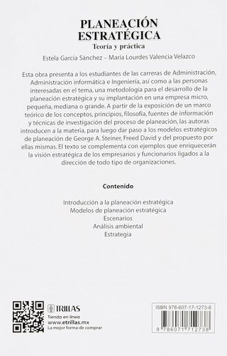 Esta obra presenta a los estudiantes de las carreras de administracion, administracion informatica e ingenieria, asi como a las personas interesadas en el tema, una metodologia para el desarrollo de la planeacion estrategica y su implantacion en una empresa micro,pequeña, mediana o grande. A partir de la exposicion de un marco teorico de los conceptos , principios, filosofia, fuentes de informacion y tecnicas de investigacion del proceso de planeacion,las autoras introducen a la materia, para luego dar paso a los modelos estrategicos de planeacion de georgea. Steiner, freed david y del presupuesto por ellas mismas. El texto se compl