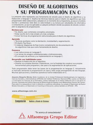 LIBRO NUEVO EMPAQUTE ORIGINAL DESCRIPCIÓN: Diseño de algoritmos y su programación en c. La presente obra representa una herramienta de estudio para el diseño de algoritmos y su traducción a lenguaje C. Explica las técnicas básicas para el diseño de algoritmos que todo programador debe seleccionar y adoptar en un momento de su trayectoria, ya sea en el ámbito escolar o profesional. Este libro no está limitado a su lectura por estudiantes de informática o computación, ya que es aplicable a cualquier profesión donde sus planes de estudio contemplen la asignatura de programación.