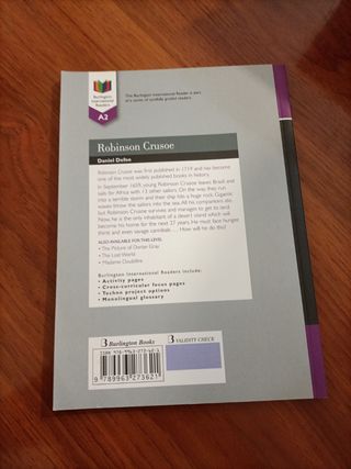 Hola buenas, vendo libro de Robinson Crusoe de Daniel Defoe (libro en inglés) de Burlington Books. Nivel A2. Lo compré y no lo he llegado a estrenar , COMPLETAMENTE NUEVO, sin abrir.