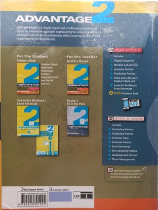 libro ingles 1 bachillerato 9789963273676 advantage. con defecto en esquina segun foto. algunos ejercicios a lapiz en unas 20 pg. Tiene marcas en las últimas páginas y rotura en la tapa trasera . Ver fotos.